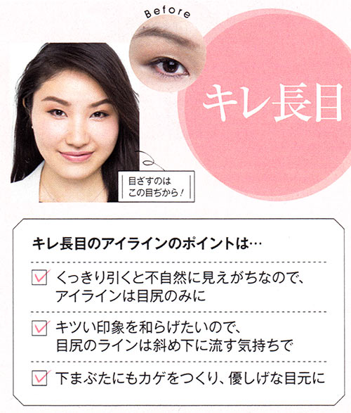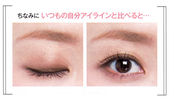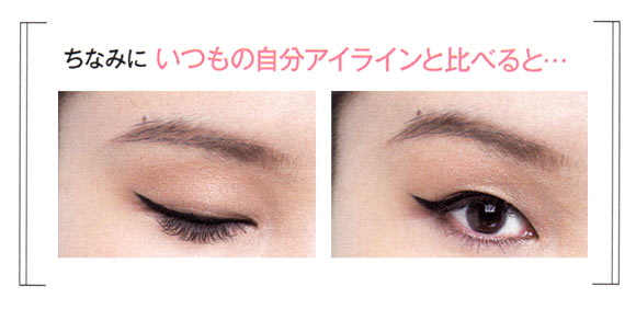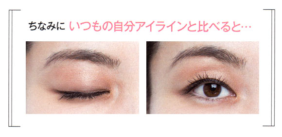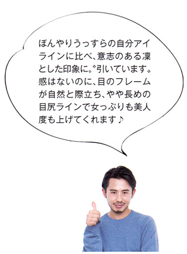 キュッとハネ上げた自分アイラインと比較すると、その差は歴然! 下げめライン&タレ目風シャドーの相乗効果で、好感度が高く、女っぽさも漂うまなざしに!