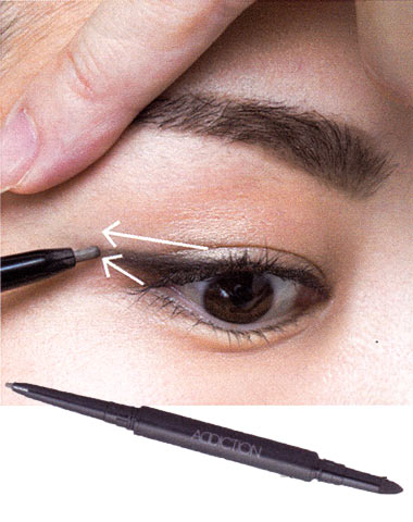 目の“補整効果”をしっかり出したいキレ長目は、ブラウンではなく黒のアイラインペンシルを使用。1で入れたシャドーをガイドにして、目なりにやや下げ気味に、目尻は8mm長く引いて。