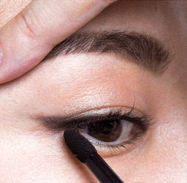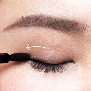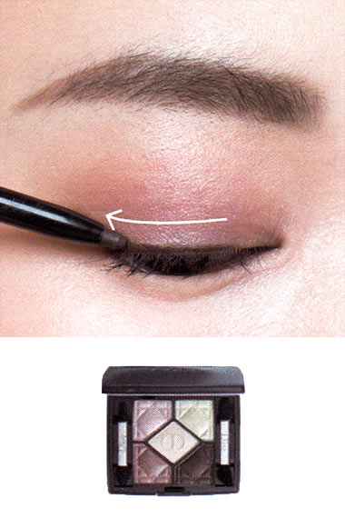 上まぶたの際に、ダークブラウンのシャドーを細いチップでのせ、深みを出して。目尻から目頭に向かってぼかし、目頭にいくにつれて薄くぼけて自然なニュアンスに。