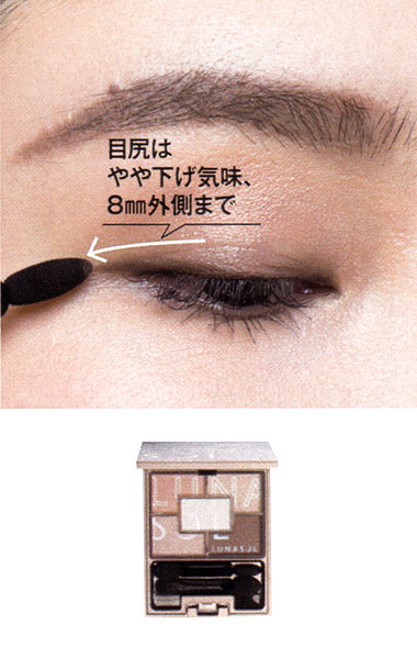 アイホール全体にブラウンベージュ(左上)をのばした後、ダークブラウン(右下)を細チップで、目の際の目尻1 / 3にライン状にオン。目尻は目なりにやや下げぎみに8mm外側までのせて。