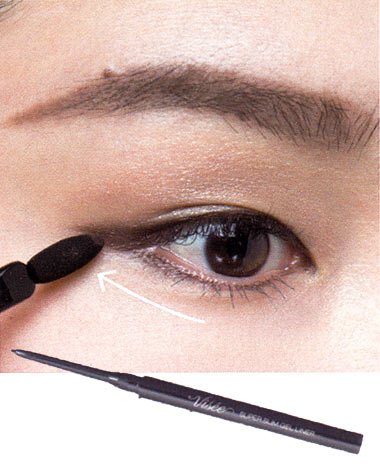 目を開いたときに隠れてしまう目頭~中間はあえて抜いて、目尻中心にライン&引き締めシャドーを。全体にラインを引くとすぐににじんでしまう奥二重目にありがちな悩みも解消され、目元がクリアな印象に。目を伏せたとき、閉じたとき、どんなときでも美しく。