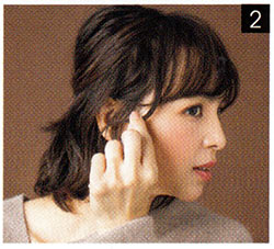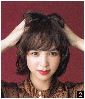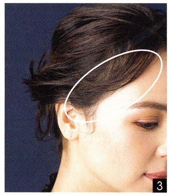 頭頂部、左右のハチの部分と耳上あたりの5ヶ所から髪をひとつまみ程度、軽くひっぱって。Aのスプレーをかけてボリュームアップ。