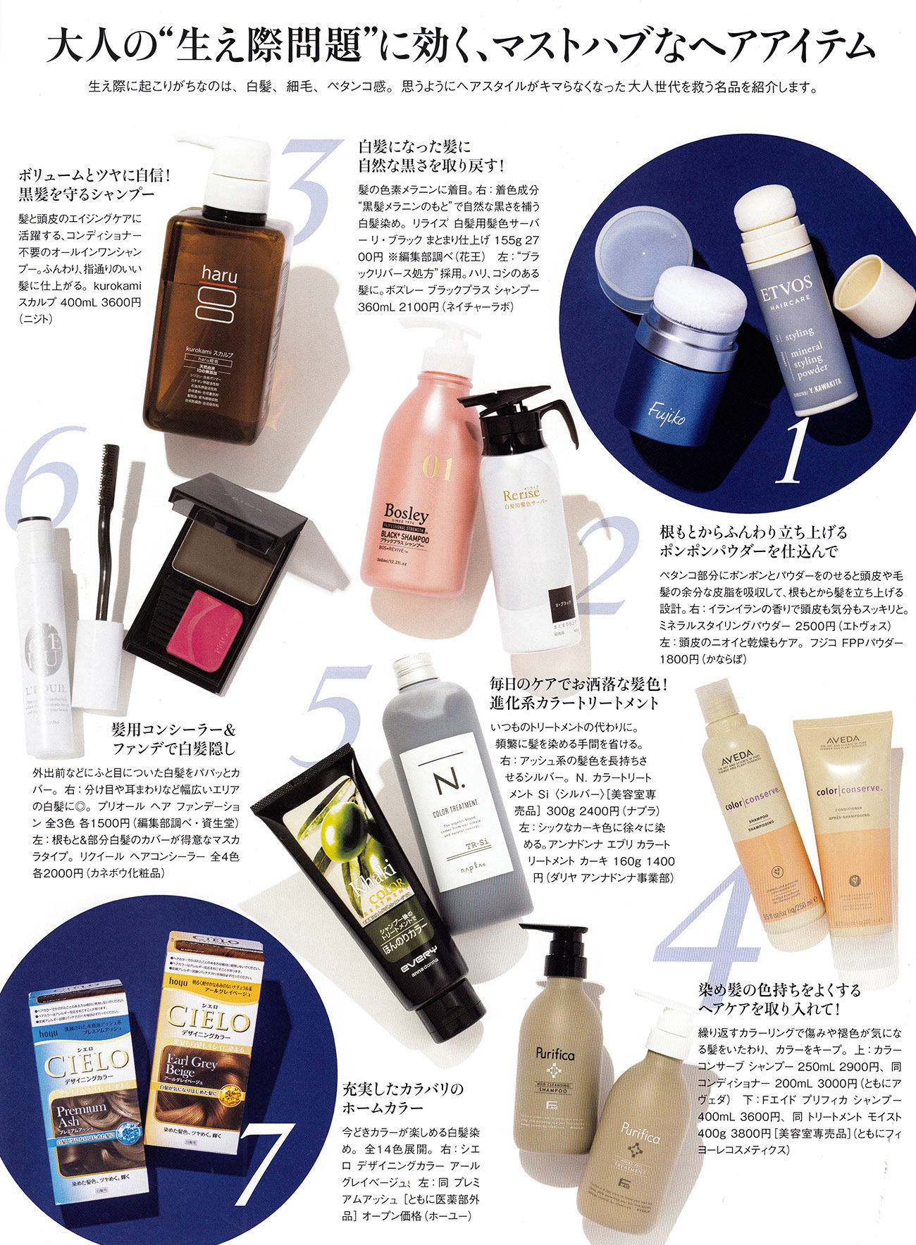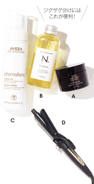 髪の分け目が広くなり、地肌が透けて見えていたらジグザグ分け目の出番です。まっすぐな分け目→ジグザグ分け目にすることで根もとが立ち上がりやすくなります。また、ツヤのある質感にスタイリングすると白髪が目立ちにくくも。