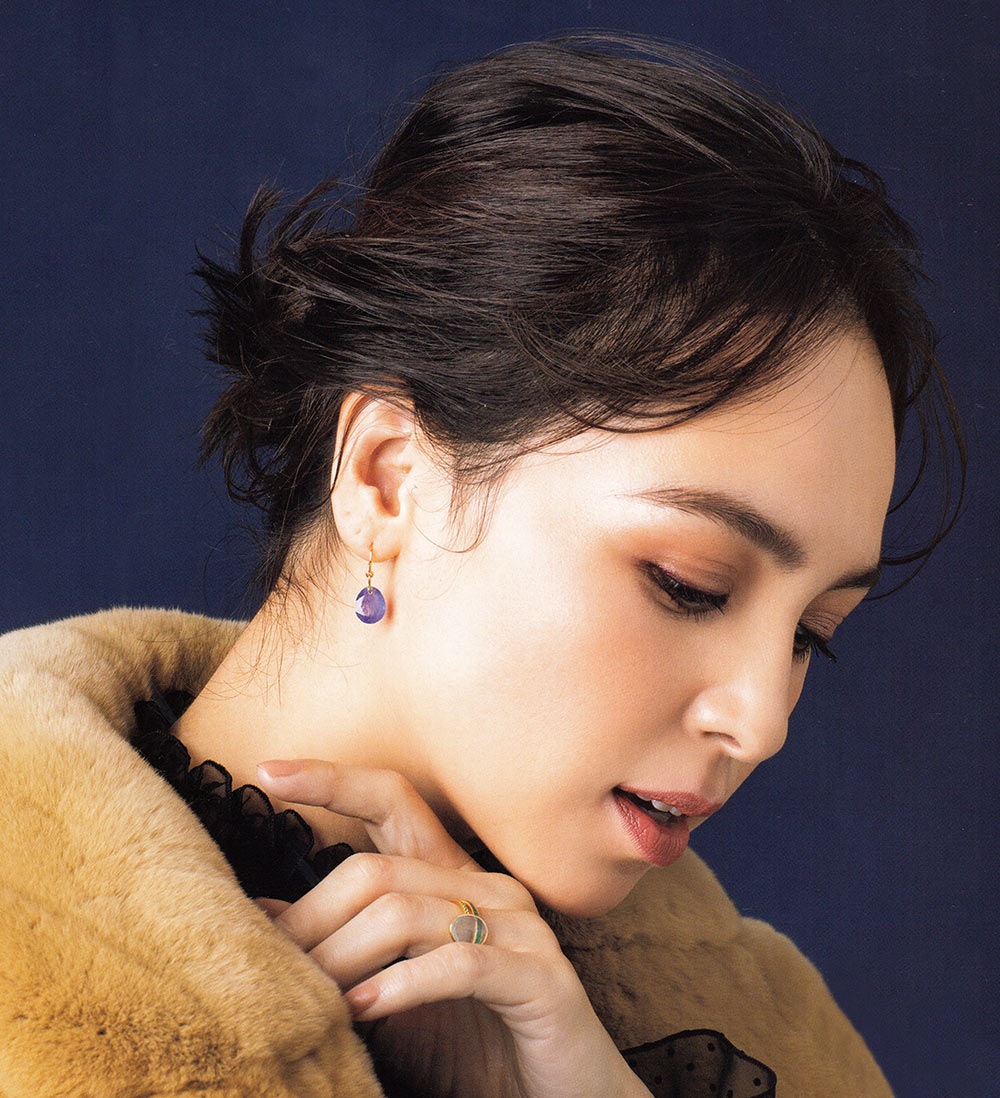 生え際にさりげなく沿わせた髪は生え際の白髪カバー要員。また、ひっつめたまとめ髪は毛量感が損なわれやすいので、トップやサイドから軽く髪を引き出して自然なボリュームと無造作感を演出し、華やかに仕上げます。