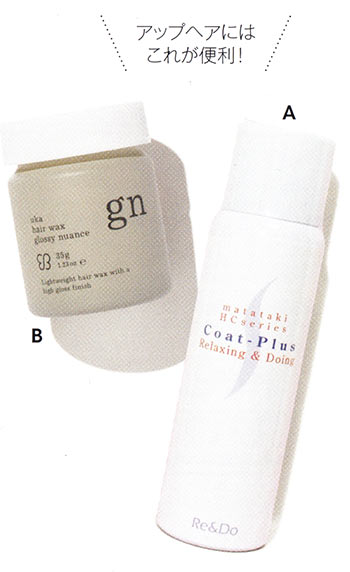 Bのツヤワックスをなじませて。ひとつ結びにし、結び目を毛先で隠すように折り込み、ピン留め。ローシニョン風のアップスタイルに。