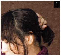 Bのボリュームを出すスタイリング剤を仕込んで。顔周りの髪を残し、低めの位置でひとつ結び。