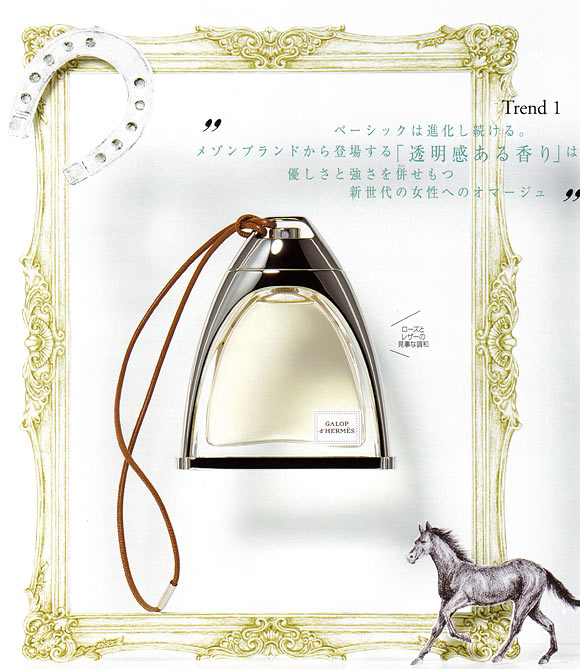 しなやかに肌へと溶け込むレザーの香りの中に、凛としたローズが加わり撥剌(はつらつ)とした表情をかもし出す。柔と躍動、相反するふたつの見事な調和を肌の上で楽しんで。