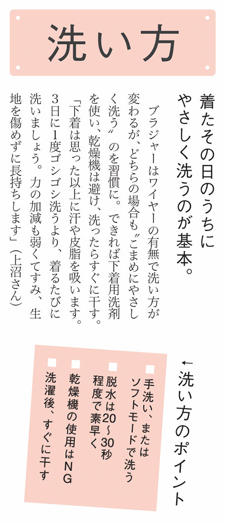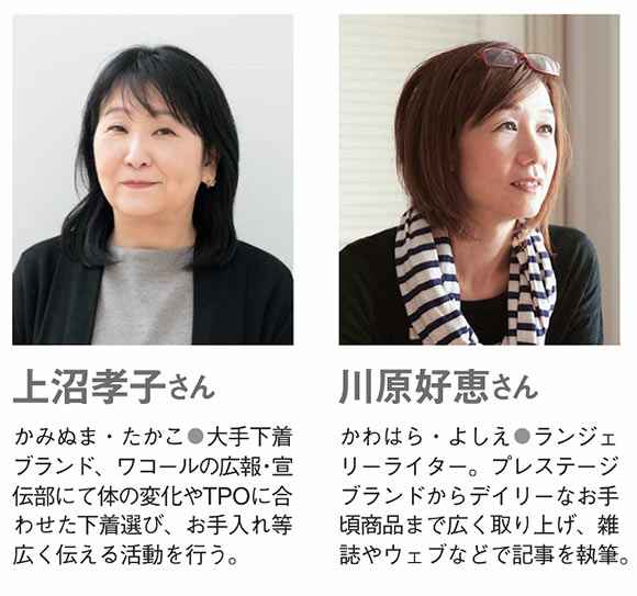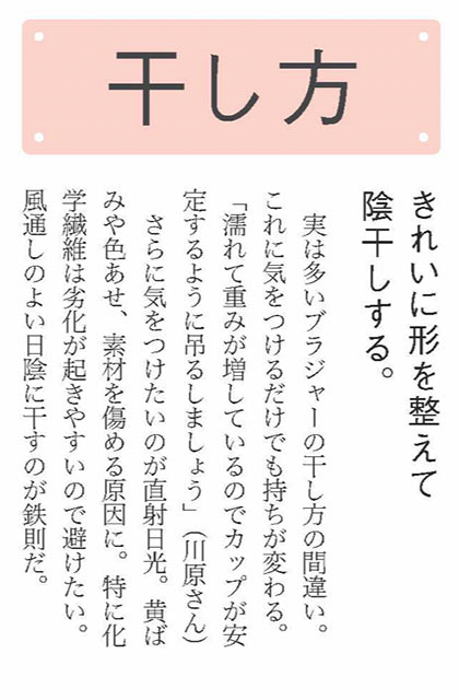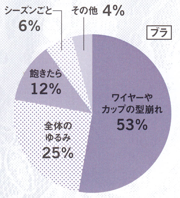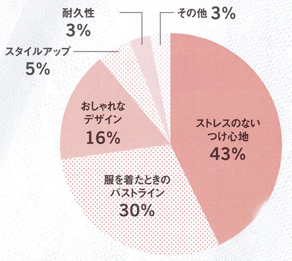 「肩が凝らない」「長時間つけていても疲れない」など、着心地のよさを求める声は、売れ行き好調のノンワイヤーブラやカップ付きキャミソールの人気からも納得。洗濯しても傷まない耐久性や、ムレにくい通気性など、働く大人世代らしい少数派意見も興味深いです。