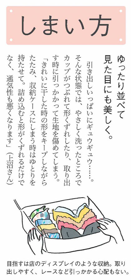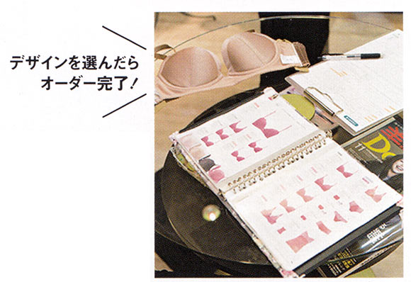 店内に並ぶブラやカタログから、好みのデザインをチョイス。国内の工場でつくられるブラは、約1ヶ月で完成。サイズ確定後は、通販やWEBオーダーが可能。