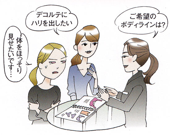 理想のボディラインを伝え、デザインや完成イメージを相談。日ごろの下着の悩みを伝えることで、候補のブラを絞っていく。オーダーの流れについてもレクチャーを受ける。