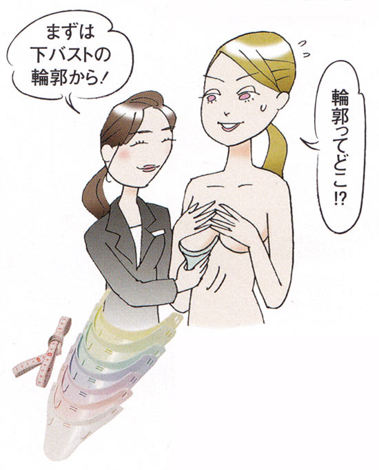 胸の底面周径を測る“デューブルベ”独自のバージスメジャーで、ワイヤーのサイズを決める。1cm単位で、アンダーバスとも測定。