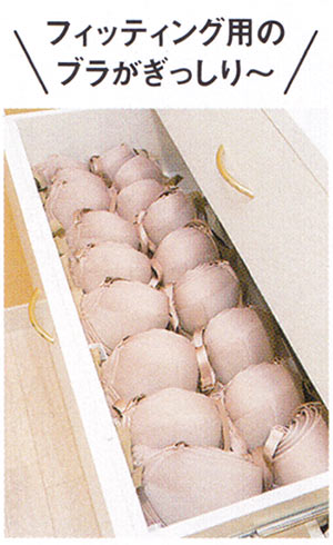 フィッティング内のチェストには、バストのボリュームを計測するための通称ゲージブラがズラリ。平均3~4パターンを試着。
