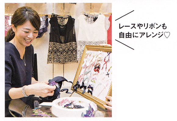 リボンやレース、ビジューなど、カスタマイズが楽しめるのもセミオーダーならでは。所要時間は、約40分。店内は、ショーツやスリップも豊富にそろう。