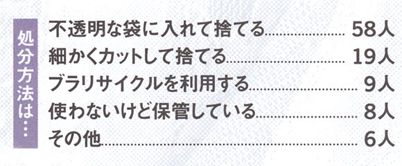 処分したい下着は、旅行先で着用してから廃棄する、実家に運んでからゴミに出す、など少数意見もいろいろ。ブラは、下着メーカーのリサイクルキャンペーンを利用するのも手。