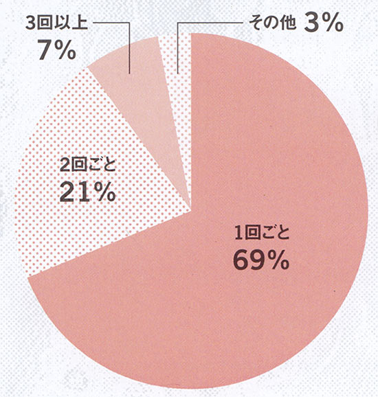 全体の約7割が、「肌に直接触れるので、清潔なものを身につけていたい」とコメント。肩崩れを避けるために、着用2回につき1回という人は2割ほど。
