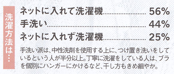 手洗い派は、中性洗剤を使用する上に、つけ置き洗いをしているという人が半分以上。丁寧に洗濯をしている人は、ブラを個別にハンガーにかけるなど、干し方もきめ細やか。