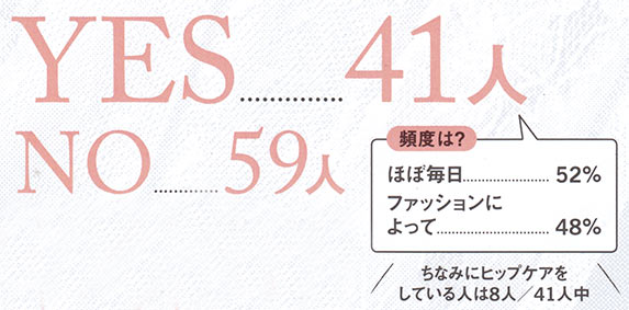 半数に迫る支持層の厚さからもわかるようにTバックやタンガの需要は増加傾向。下着のラインがひびきにくいほか、ヒップを支える機能がないため、お尻に意識が集中してヒップアップ効果が期待できるという声も。さらに、締めつけや摩擦がないので、吹き出物が出にくいのも利点。