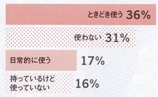 日常的に使っている人の過半数が、ガードルを愛用中。ときどき使う、と答えた人は、タイトな服を着るときのみガードルやボディシェイパーを。使わない派の中にも、補正下着に興味あり、が多く、関心度は高そう。
