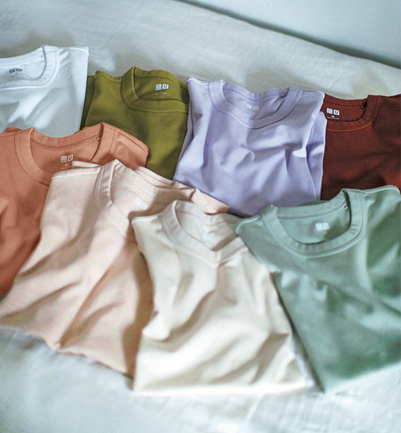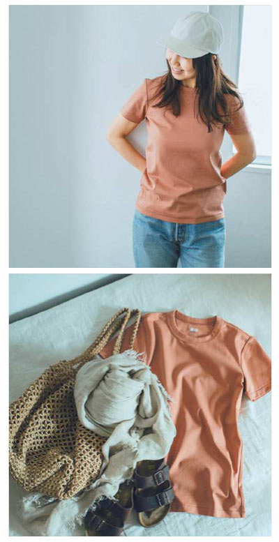 世界的デザイナーのクリストフ・ルメール率いるデザイナーチームが手がけるUniqlo Uは、コレクション自体がすでに名品。今回のTシャツは、カラー展開が豊富で、それぞれのカラーリングも絶妙。スモーキーな色みで差し色にも◎。ゆるすぎないほどよい着用感で、一枚でもインナーとしても使えます。今季色物を選ぶなら、幅広い色と相性のいいオレンジやグリーンがおすすめです。