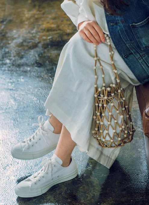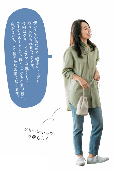 最近はカードとスマートフォンさえあれば手軽に出かけられるから、荷物がどんどん減っていますよね。そんな世の中の動きもあってか、ここ数年は小さめバッグが人気です。そのなかからチョイスしたのが定番になりつつある巾着バッグ。手提げとしてはもちろん、肩にかけても、斜めがけにしても使えるうえ、細めのひもだから、結んで使ってもOK。思い切った遠出もいまはなかなかむずかしいので、こんな「ちょっとそこまでバッグ、いかがでしょう。