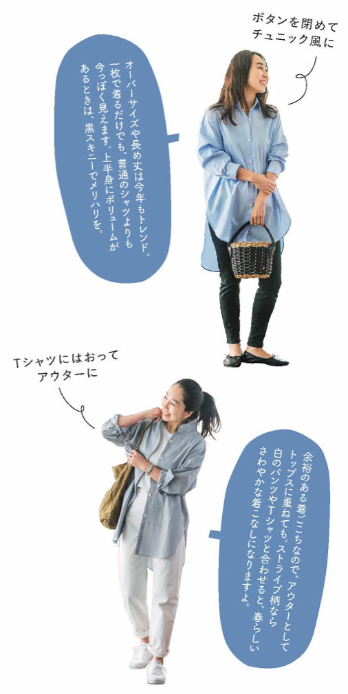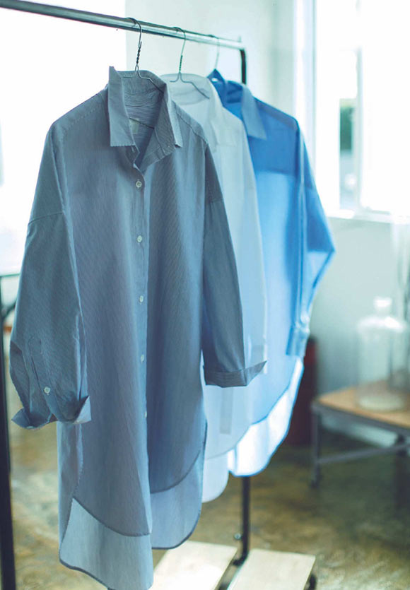 今回のアイテムは、この春に着たいシャツをエルーラと考えたコラボ商品。ポイントは、ゆったりとしたサイズ感と、長さの違う丈。体型をカバーできるのはもちろん、一枚で着たり、はおって上着にしたり、ウエストをベルトで結んだりと幅広い着こなしができるんです。ボトムを選ぶときは、シルエットが細身のものが相性◎。