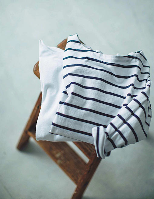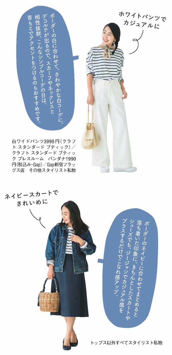 アウターを重ねても、一枚でも決まるボーダーのトップスがあると便利です。今回のアイテムは、厚手の生地とゆったりシルエットが特中性的になりがちなアイテムですが、首まわりが見えるので女性らしい印象に。ボーダーに合わせて服の色数をしぼると上品にまとまりますよ。