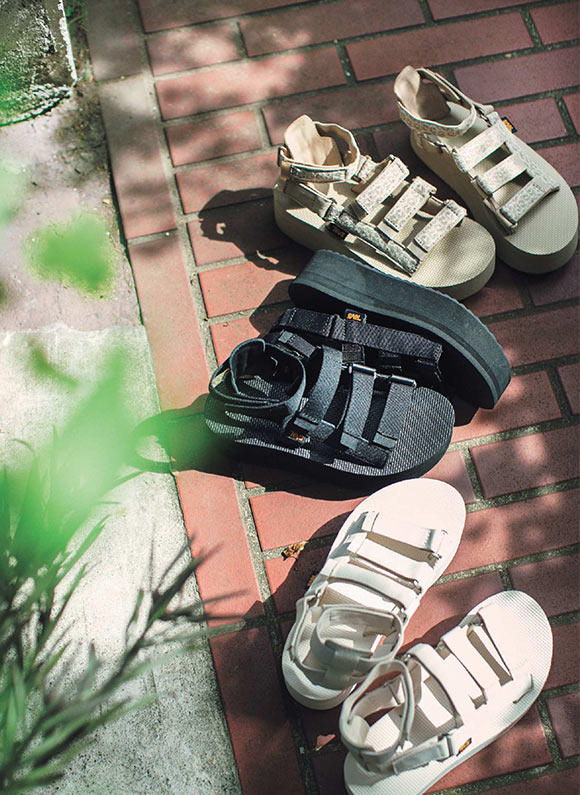 レジャーシーンでも街歩きでも活躍するスポーツサンダルは、夏の定番。今回のTevaのアイテムは、ボリューム感のあるソールやストラップが今年らしくて気になります。ソールがほどよい高さだから大人でも取り入れやすく、全身がスラリとして見えますよ。シンプルな切りっぱなしのデニムパンツと合わせるだけでもこなれて見えるし、あえてフェミニンなアイテムに合わせて、今っぽくスポーツミックスに仕上げるのもおすすめです。ぜひトライしてみて。
