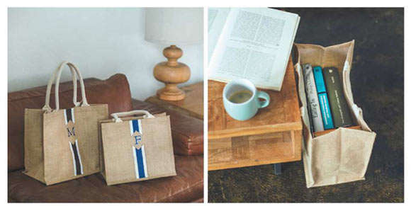 無着色のジュート素材で作ったバッグ。持ち手はクッション性のある芯材を使い、肩かけでも手持ちでも使えます。B5が16.5kg、A4A3は20kgまでの重さに耐えられ、強度も◎。