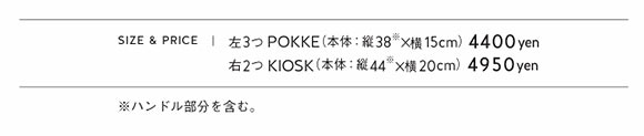レジ袋の形をベースに、機能と遊び心を加えた「REGII」シリーズ。POKKEは500mlペットボトルが2本ほど、KIOSKは4本ほど入るサイズ。いずれも12色展開。