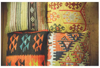 キリム(西アジアの遊牧民の伝統的な織物のこと)で作られたクッションカバー。遊牧民の女性たちが一つ一つ織り上げていくため、すべてが一点物。