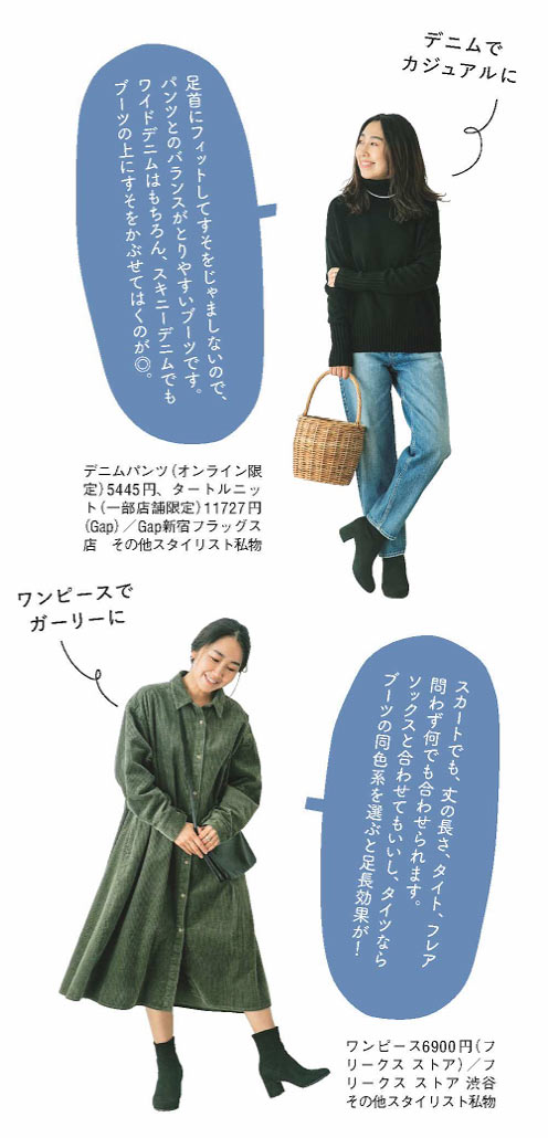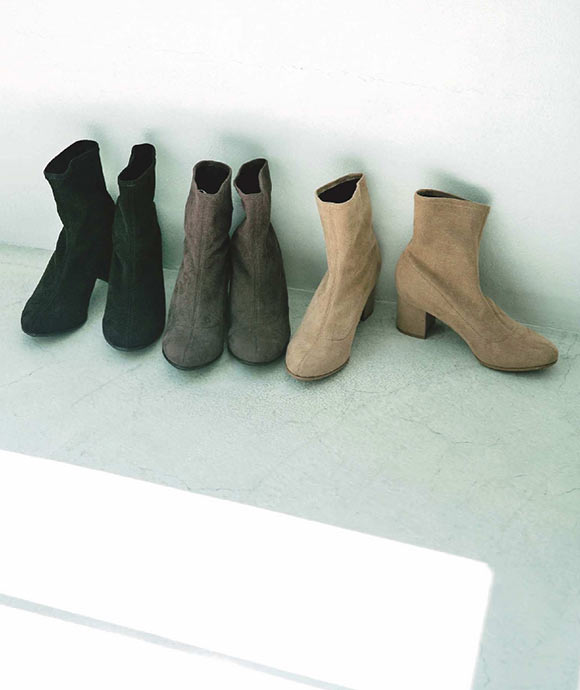 ボトムを選ばず、使いやすさ抜群だからほかの撮影でも出番が多いこのブーツ。レザーブーツほどの重厚感はなく、重たい印象にならないので、寒くなり始めのこの時期にぴったりです。はき口が狭いストレッチブーツは足首を細く見せ、スタイルアップ効果が。美脚効果と安定感を両立する太めのヒールもポイントです。