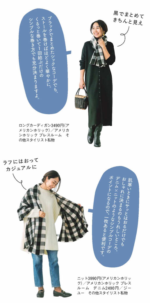 服装が重たい色になりがちな秋冬は、ストールを巻くだけで顔まわりが華やかに。Gapのこのストールは、大判&薄手で巻きやすく、しっとりとした肌ざわり。ストンと落ちる柔らかい生地なので、ぐるぐる巻いてもボリューミーになりすぎず、すっきりまとまります。チェック柄でも、モノトーンなら大人でも取り入れやすいですよ。