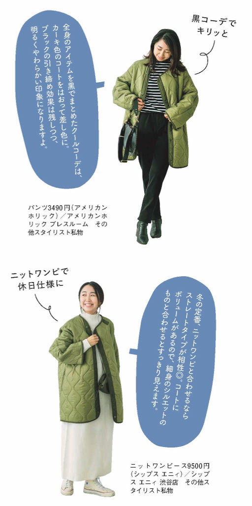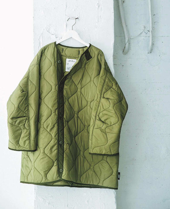 軽くて暖かく、アクティブなシーンにも使えるのが魅力のキルティングコート。今回の商品は、ほどよいボリュームとゆったりシルエットが今年らしい一着。余裕のある着ごこちなので厚手のニットとも合わせられますが、タイトなものでも女性らしく決まります。もちろんミリタリー風味を生かして、辛口コーデを楽しんでも♪