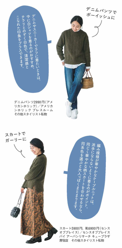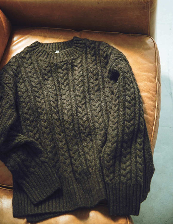 寒さの厳しい高原で育つヤクの毛が使われているから、とっても暖か。寒い日に心強いのはもちろん、デザインにも注目。ケーブル編みの模様がアクセントになるので、シンプルなコーディネートでも寂しい印象にはなりません。サイズが豊富なので、大きめをゆったりと着てもいいし、小さめならワイドパンツと相性がいいですよ。