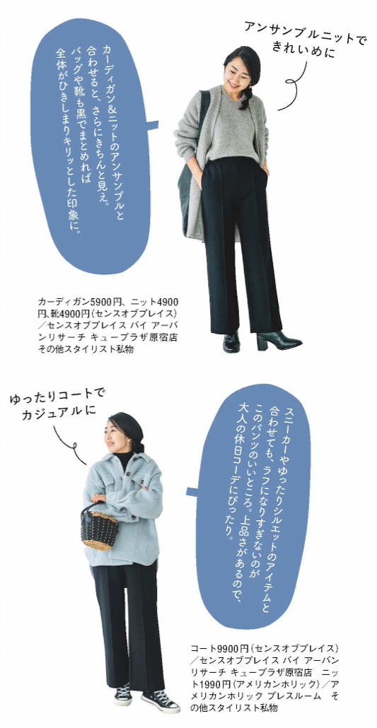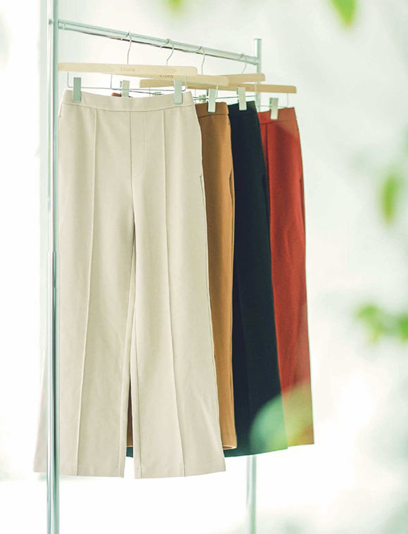 寒さが厳しい今の時期にご紹介したいのがこのパンツ。裏地が起毛素材なので一枚でも暖かく、伸縮性もあってはきごこち抜群。部屋着にしたいくらいラクチンなのに、センターのピンタックやほどよいワイド感のおかげで脚がきれいに見えます。きちんと感があるのに長時間はいてもストレスフリーだから、通勤着にもおすすめ!