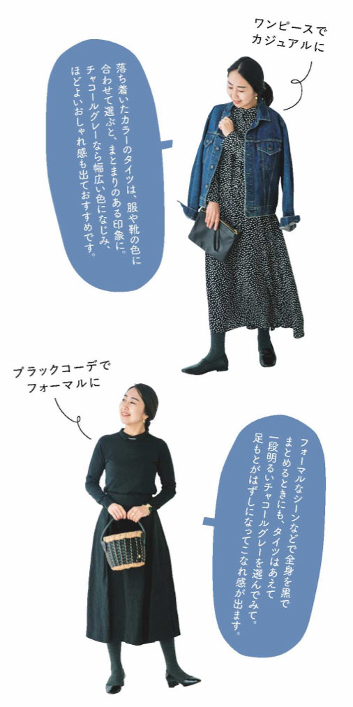 厚手のタイツは、冷え込む真冬の必需品。このタイツは肉厚な生地でウエストまですっぽり包むから、おなかまで暖か。かかとつきの形状ではきやすく、フィット感抜群です。また、見た目にもご注目。マットな質感は、まるで海外ブランドのタイツのよう。定番の黒はもちろん、使い勝手のいいチャコールグレーもぜひ試してみて。