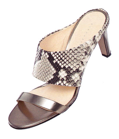 トレンドに浮上しているパイソン柄を、メタリックとコンビにしたトレンド感高の一足。シンプルな細身パンツと合わせてカリッとモードに。