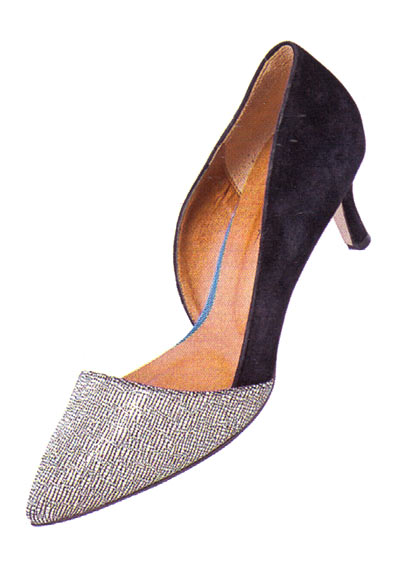 女性らしくエレガントなベージュシューズに、トリミングで今どきのアクセントを加えて。シャープなV字のカッティングが足をすっきり見せてくれる効果も。