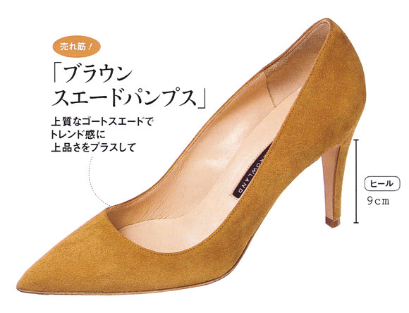 売れ筋のシンプルな9cmパンプスの今シーズンのイチ推しは、トレンドの70′Sテイストをほんのり感じさせるブラウンスエード。ファッションのバイヤーチームとも相談を重ねて完成した逸品は、きれいめ服とも合わせやすい上品なカラーリング。