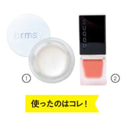 ピンクみのある2のオレンジリップを塗った上に、1のバームを指にとって重ねづけ。目元と同色を使うことで、洗練されたワントーンメイクに仕上がります。ブルベ肌に血色を与えてくれるピンクと、光の加減で出現するイエローのコラボが何ともおしゃれ♪