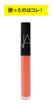 黄みがかった優しいオレンジ色のグロスをさっとひと塗り。目にポイントを置くので、リップとチークはほんのり色みを感じる程度に薄づけして。