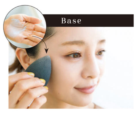イエベ肌の黄ぐすみを補整し、透明感を与えてくれるブルーのコントロールカラ1を手のひらでのばして顔に塗ったら、軽やかな仕上がりの2を両頬、目のまわり、鼻筋、あごにのせ、顔全体に薄く広げます。厚塗りを防ぎ、肌と一体感を出すためにしずく形のスポレンジでならすのがakiico流。