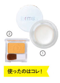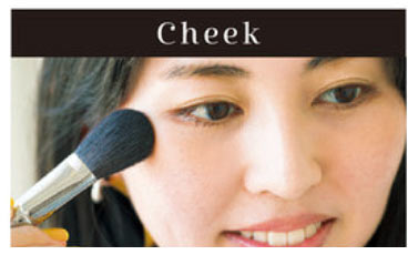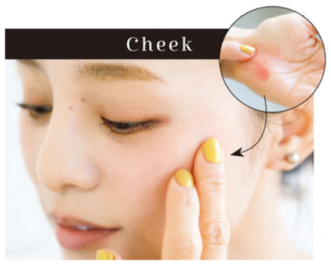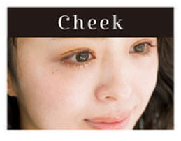 みずみずしさを失う大人肌のほっぺに大切なのはツヤ感。顔を明るく、若々しく見せてくれる1のハイライターを2のチークと混ぜて使います。1と2を手のひらでよく混ぜてのばしたら、笑ったときに頬が一番高くなる部分にのせて、指でポンポンとスタンプを押すように左右に薄く広げて。