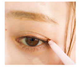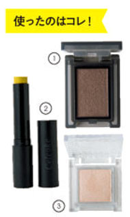 2を指の腹に取り、アイホール全体にごく薄く塗った上に3のパールを重ね、ほんのりイエローを感じる程度にぼかします。1をまつ毛のキワを埋めるように細く入れ、アイシャドウ代わりにすれば目元がグッと引き締まり、バッと目を引く印象的なメリハリEyeに♪