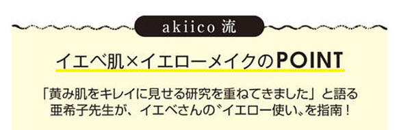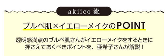 イエベさんはベースの作り方次第で印象がガラリと変わります。元の肌を生かせばエキゾチックに、白色補整すればソフトな雰囲気に。くすみをOFFするコントロールカラーで白見せするのがakiico流。黄み肌にも透明感が出現しますよ♪