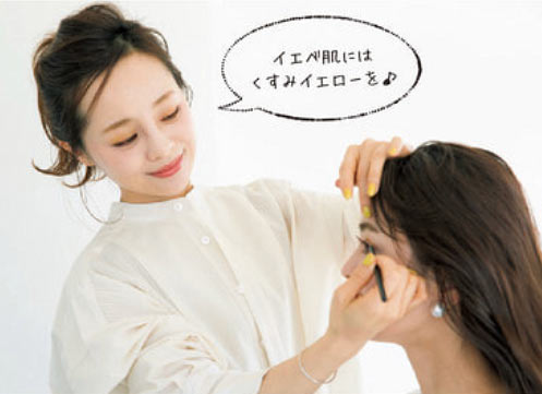 多くの欧米人と近い肌色を持つブルベさんなら、明るいイエローもよくお似合い(うらやましい~)。でも顔色悪く見えちゃうと台無しだから、血色感を出してくれるピンクのコントロールカラーでしっかり肌色を明るく補整しておいて♪