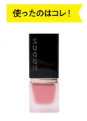 マスカラの色と同系色のピンクチークを、頬の一番高い位置を中心に薄くぼかすように入れます。目のイエローがポイントなので、チークはやや血色を感じる程度に淡くのせるようにして。