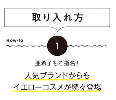 いつも時短でできるナチュラルなブラウンメイク一辺倒・。メイクには疎いので、イエローメイクが流行っていると聞いて驚き! モードな雰囲気になっちゃいそうで不安です。