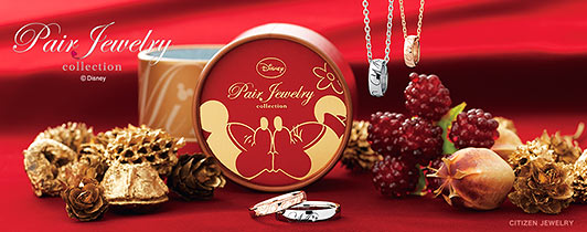 クリスマス限定&人気のディズニー♪ ゆるやかなカーブを描くオシャレなペアリング。二つ重ねると内側にハートが重なり、ミッキーとミニーがKISSをするムード満点のデザインも◎
