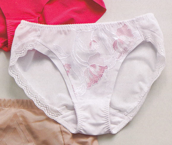 上 / 極薄で伸縮性が高いリバーレースとチュール素材が肌になじみ、ショーツラインがまったく気にならない。つばめの刺しゅうが美しく、高級感のある大人のショーツ。